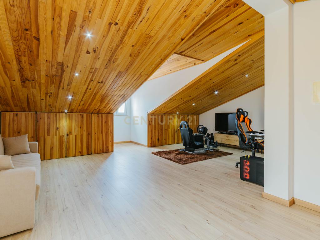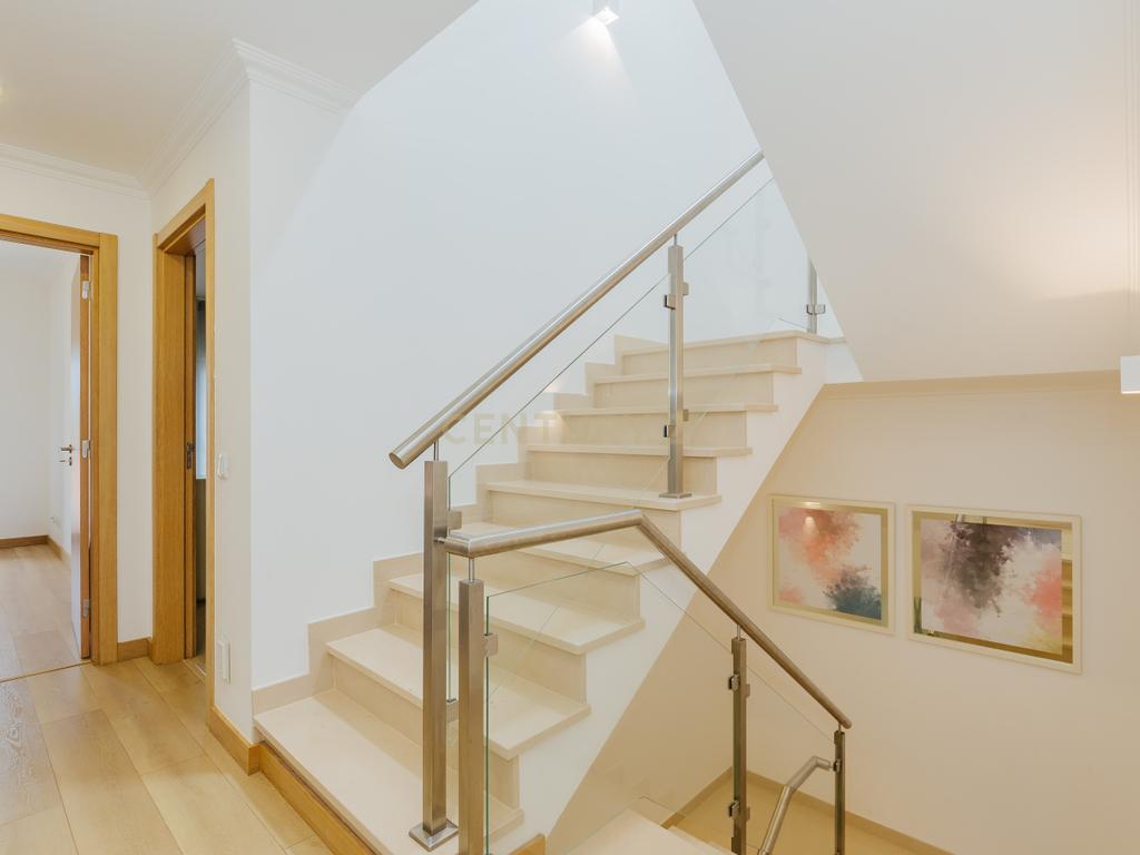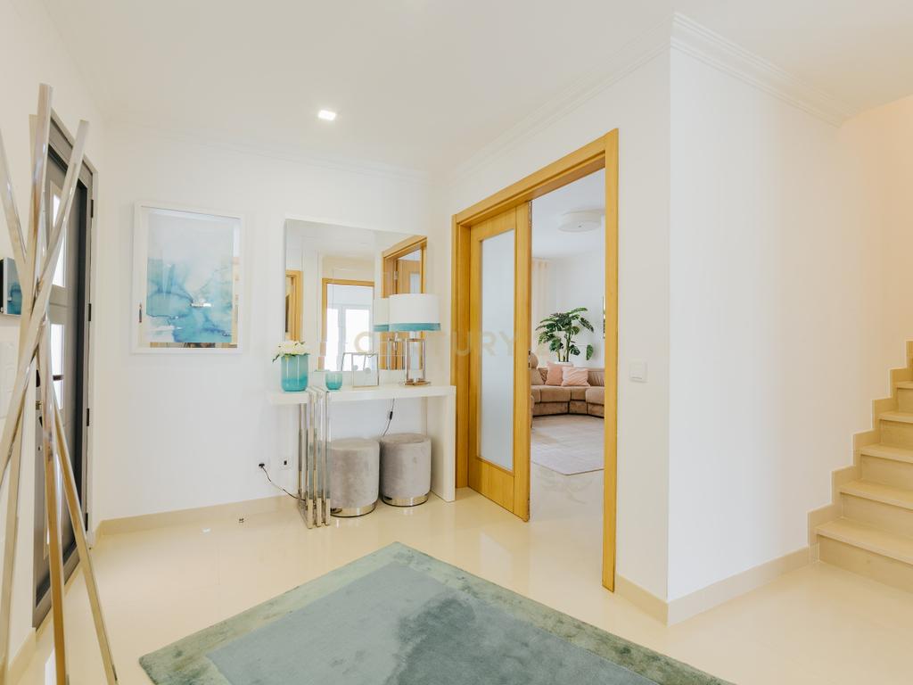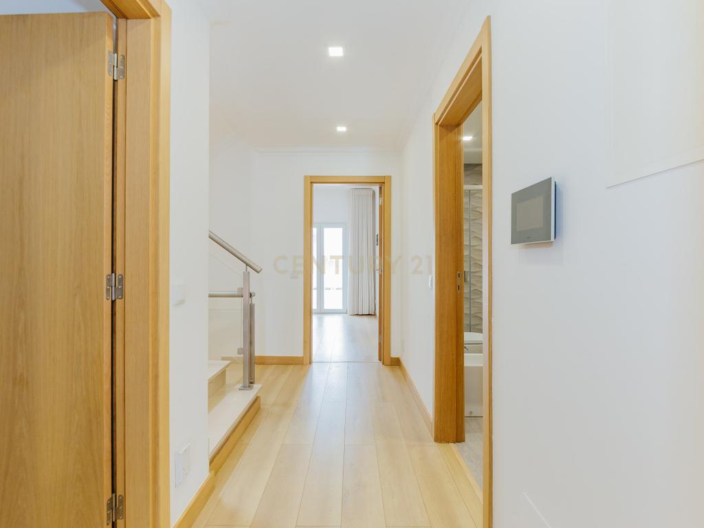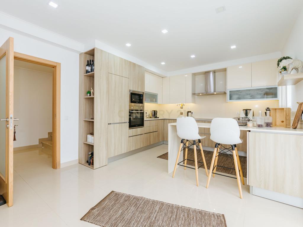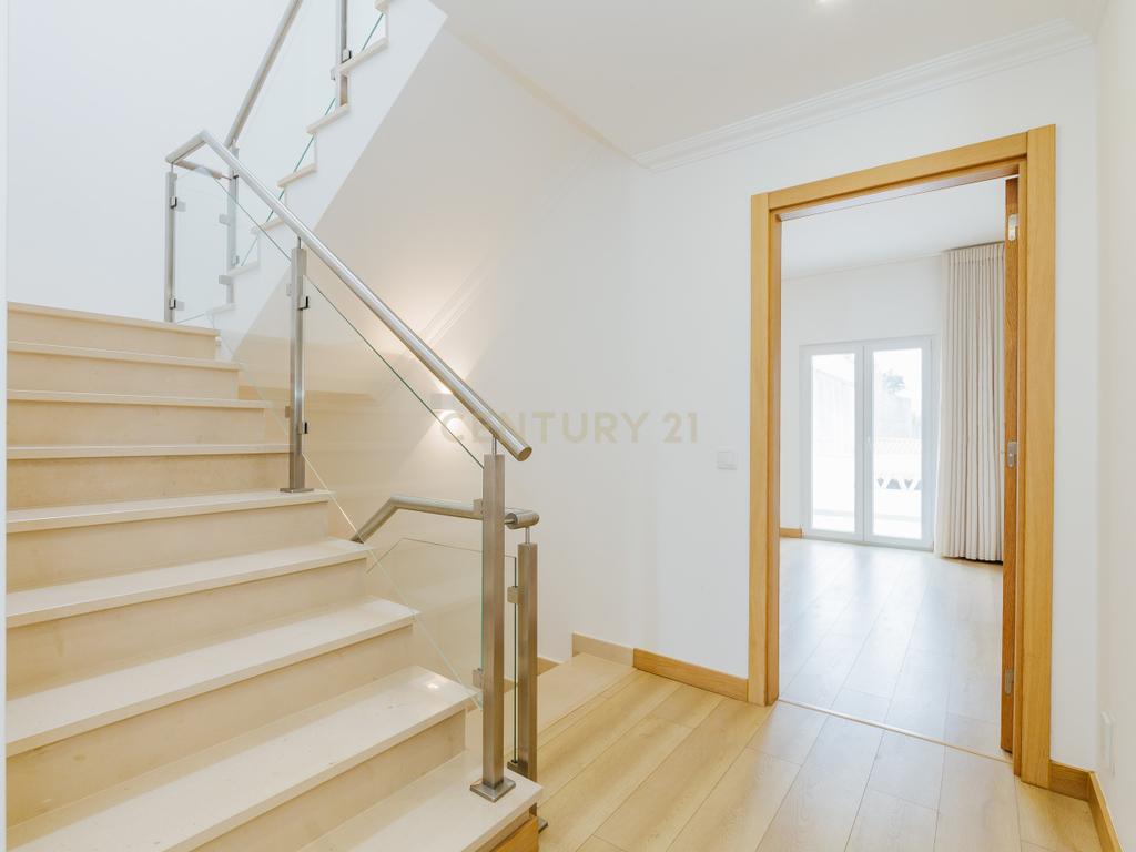 A moradia apresenta um layout inteligente, com área social no piso térreo com jardim e churrasqueira, zonas dos quartos no 1º andar e um sótão amplo no último piso, espaço versátil e adaptável às mais variadas utilizações. A cozinha encontra-se equipada com todos os eletrodomésticos, como placa, forno, exaustor, esquentador, micro-ondas, máquina de lavar roupa e loiça e frigorifico . Os acabamentos em mármore e o piso flutuante conferem um toque de elegância, enquanto as varandas e o espaço exterior são ideais para momentos de lazer.
