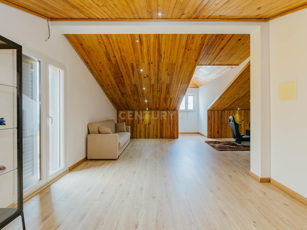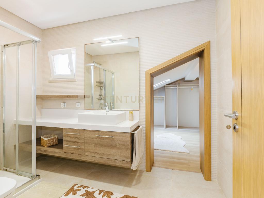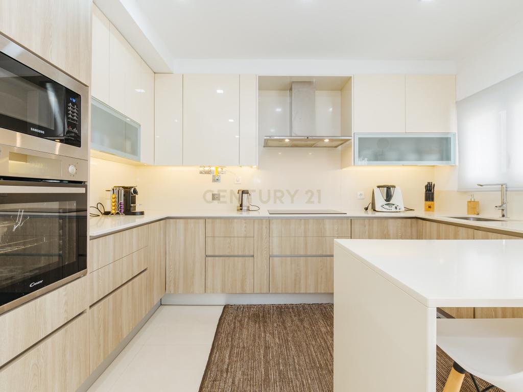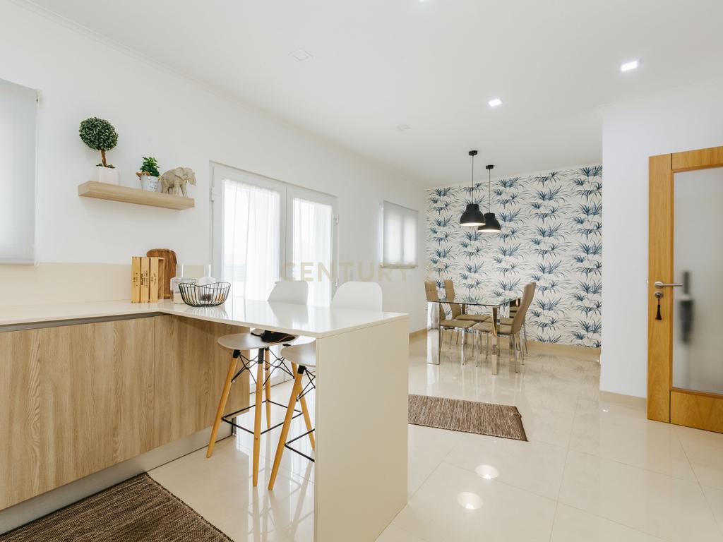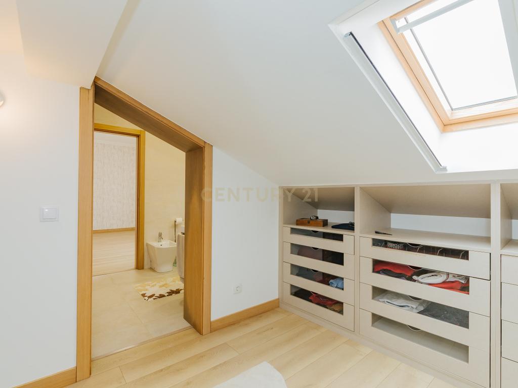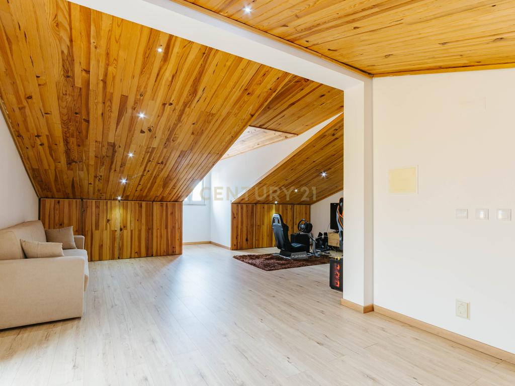 A moradia apresenta um layout inteligente, com área social no piso térreo com jardim e churrasqueira, zonas dos quartos no 1º andar e um sótão amplo no último piso, espaço versátil e adaptável às mais variadas utilizações. A cozinha encontra-se equipada com todos os eletrodomésticos, como placa, forno, exaustor, esquentador, micro-ondas, máquina de lavar roupa e loiça e frigorifico . Os acabamentos em mármore e o piso flutuante conferem um toque de elegância, enquanto as varandas e o espaço exterior são ideais para momentos de lazer.
